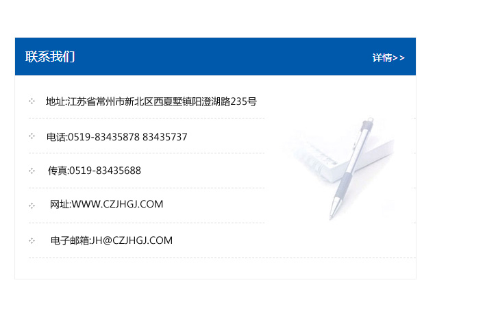 傳真:0519-83435688    郵編:213135    網址:WWW.czjhgj_com.360-ic.com    電子郵箱:JH@czjhgj_com.360-ic.com